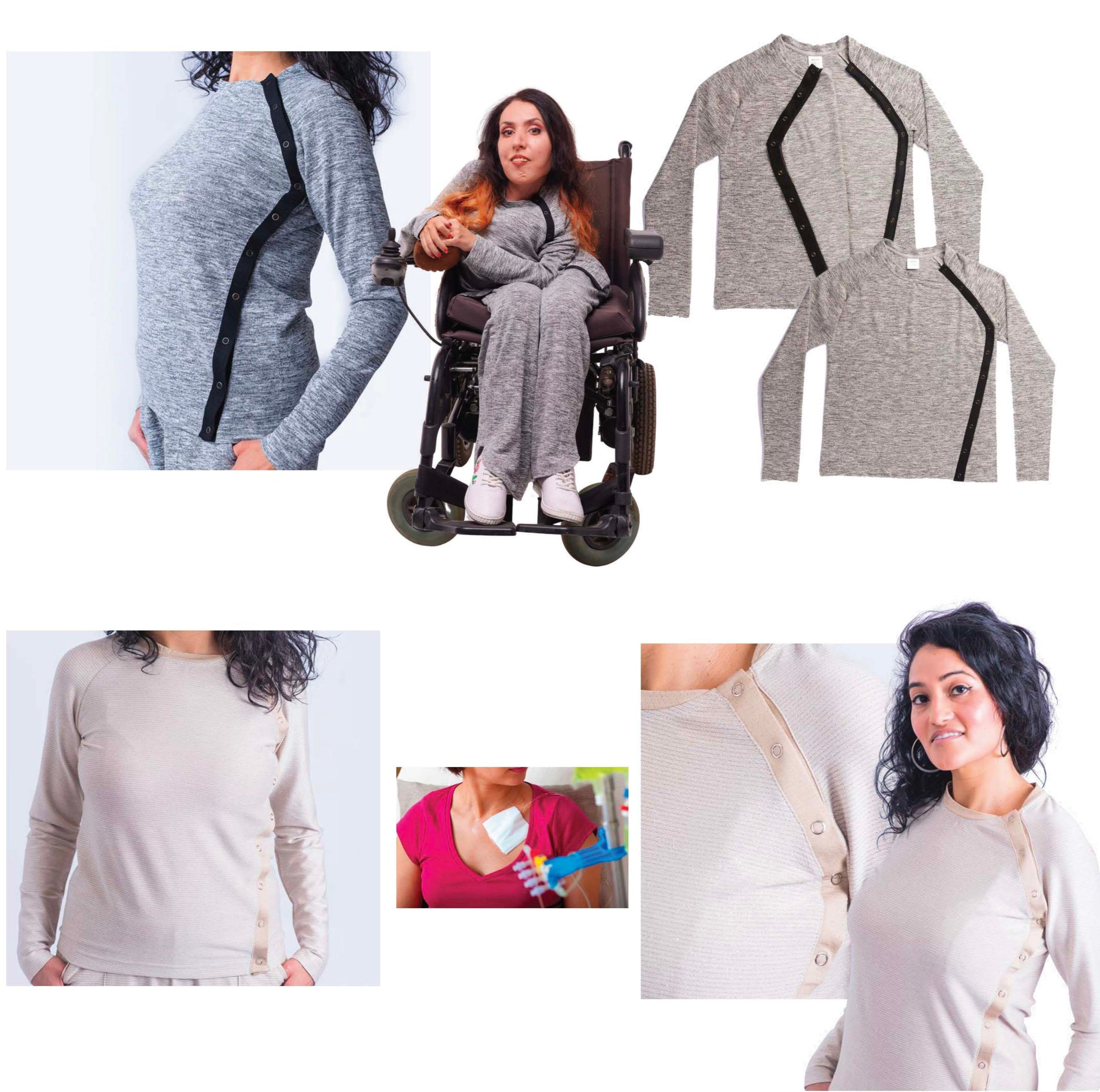 Explore our collection of adaptive women's tops, including stylish one-piece bodysuits and easy-access designs. Combining fashion with functionality, our tops and front-snap bras offer convenience and comfort without sacrificing style. Discover adaptive clothing that meets your needs with effortless elegance.